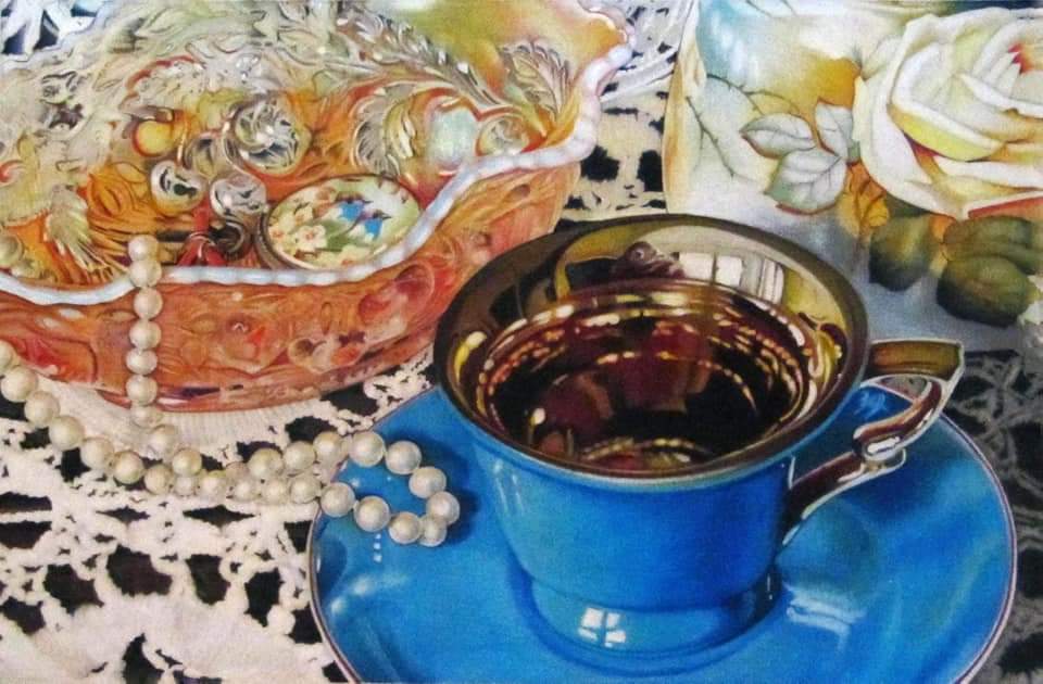 "This drawing was on the drawing table the night we had a house fire. As a result, it was completed in the lobby of the Quality Inn where we lived for a few weeks until insurance found us a rental house to live in while our house got fixed. Though covered in a thin veil of metallic smoke residue and in the very early stages of creation, it was discovered smoke would erase. I decided to utilize that discovery and erase the tablecloth into being. Smoke remains in the upper left area along the far edge of the dish, so the original especially feels more like an artifact of an experience I will never forget." --Jennifer Carpenter