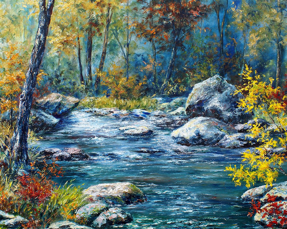 Just a glimpse of a roadside stream with rushing water and rocks made it to oil and canvas.