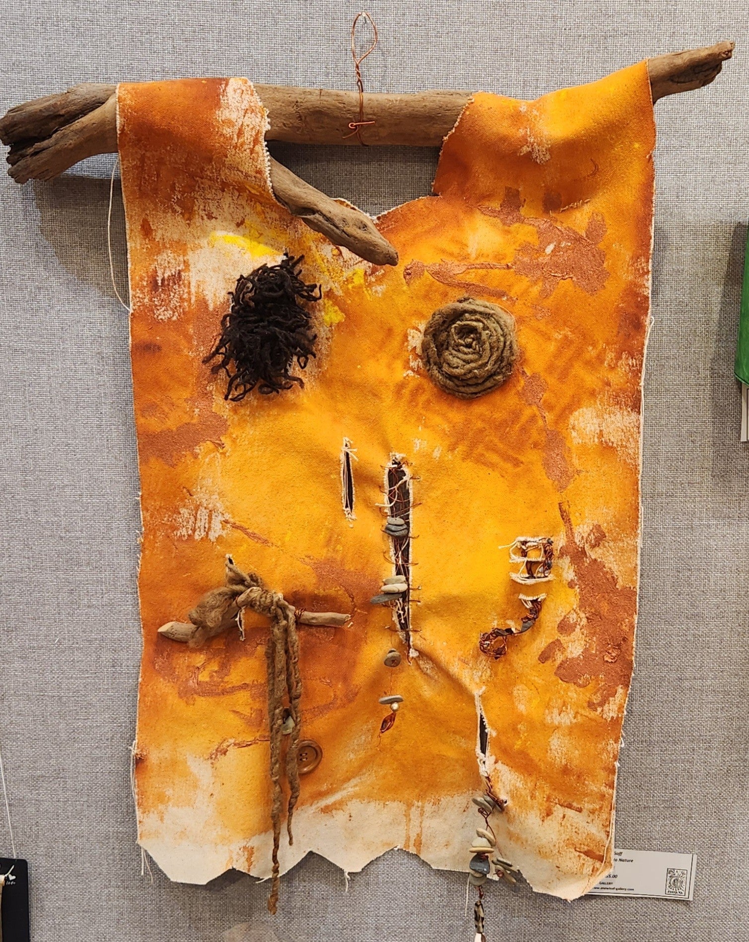 Working from my sunny porch, I felt close to nature as I listened to the birds and looked into the woods. This piece is created from a Driftwood branch with canvas backdrop and a mix of fibers, rocks, copper.