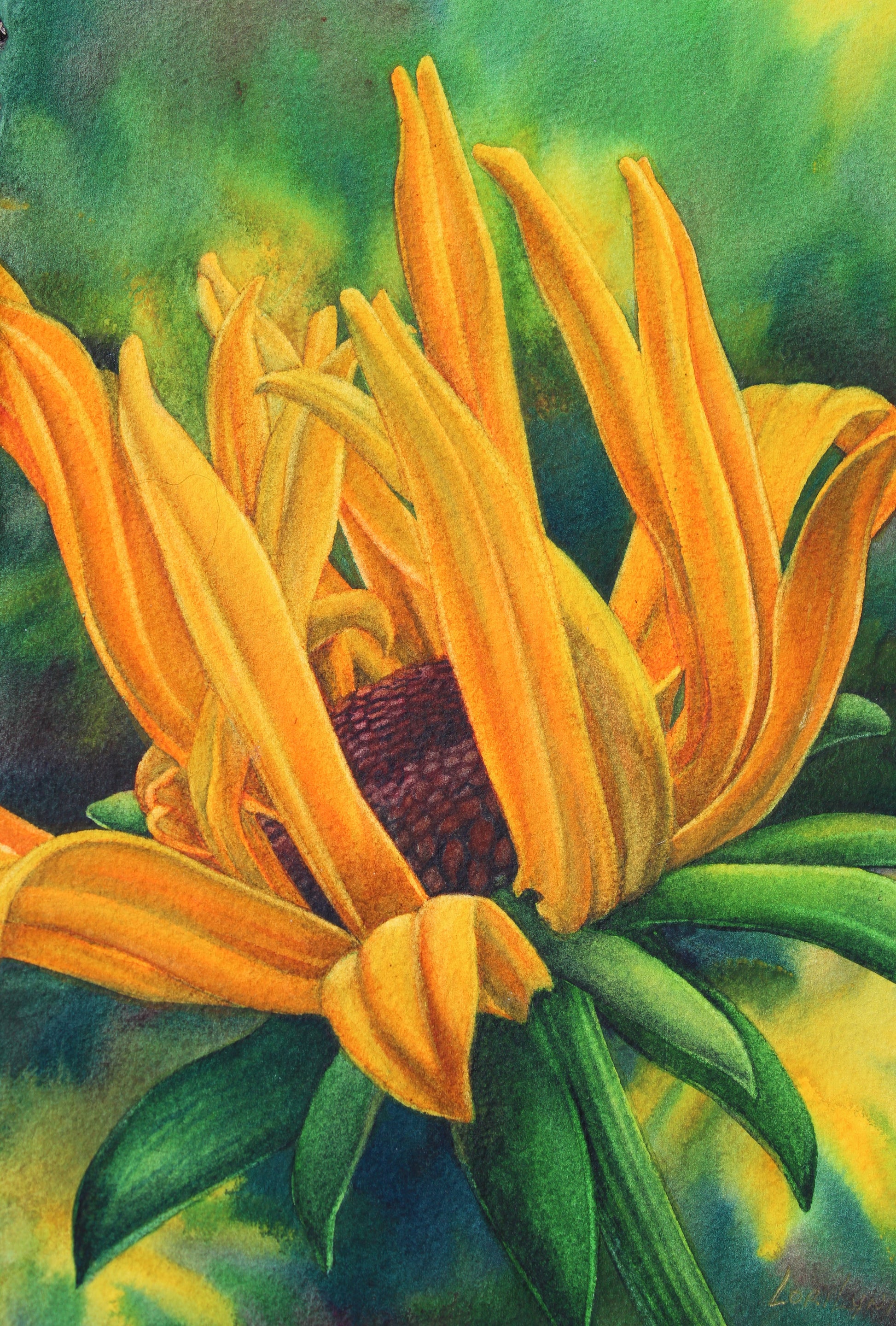 Framed and matted with the painting extended onto the matting.