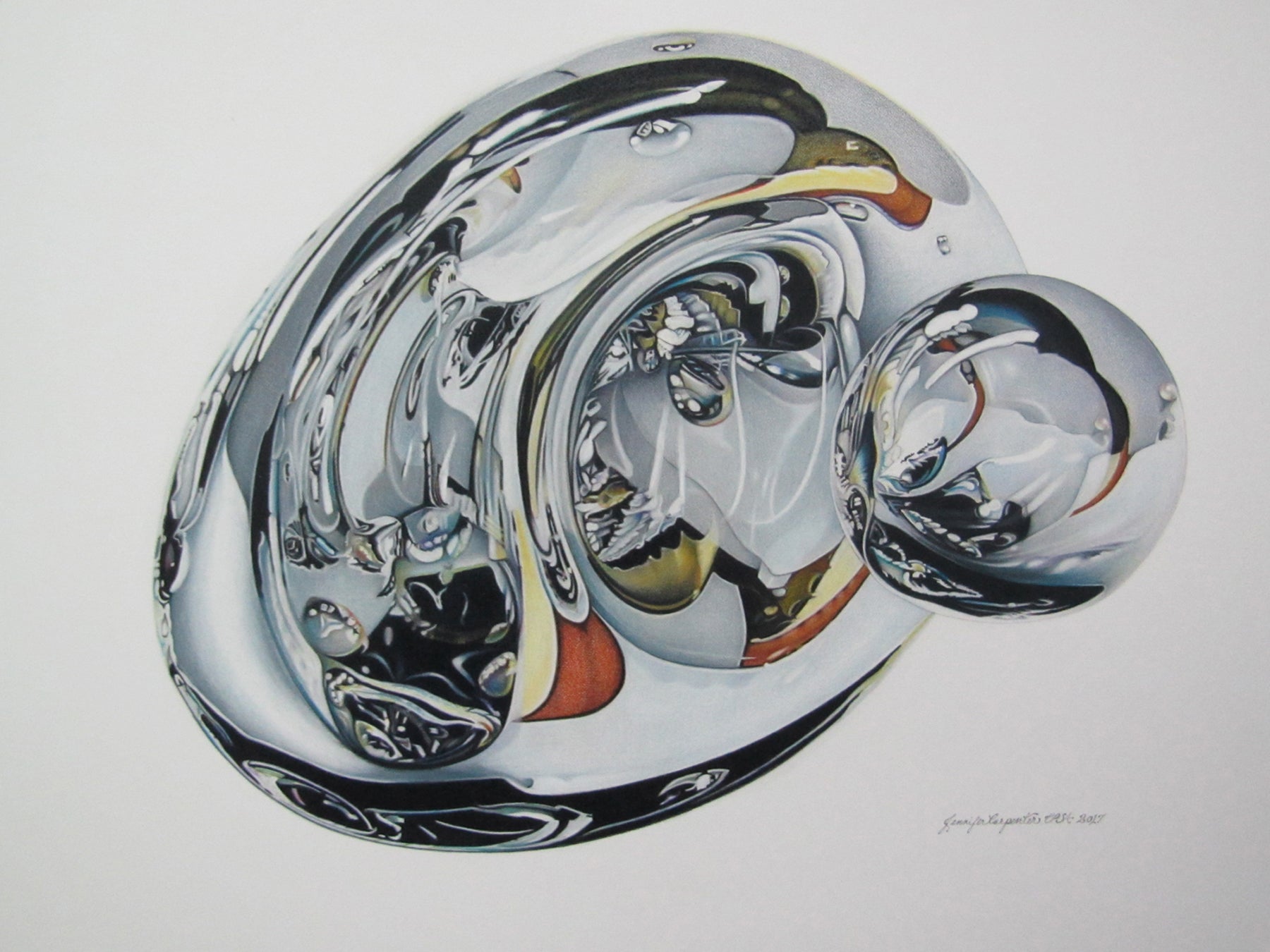 Ever drop a thermometer and have little balls of mercury go flying? The artist was reminded of this during the creation of this piece, but inspiration was actually found elsewhere...inside a blown glass paperweight! Bubbles! Pretty neat, seen larger than life.