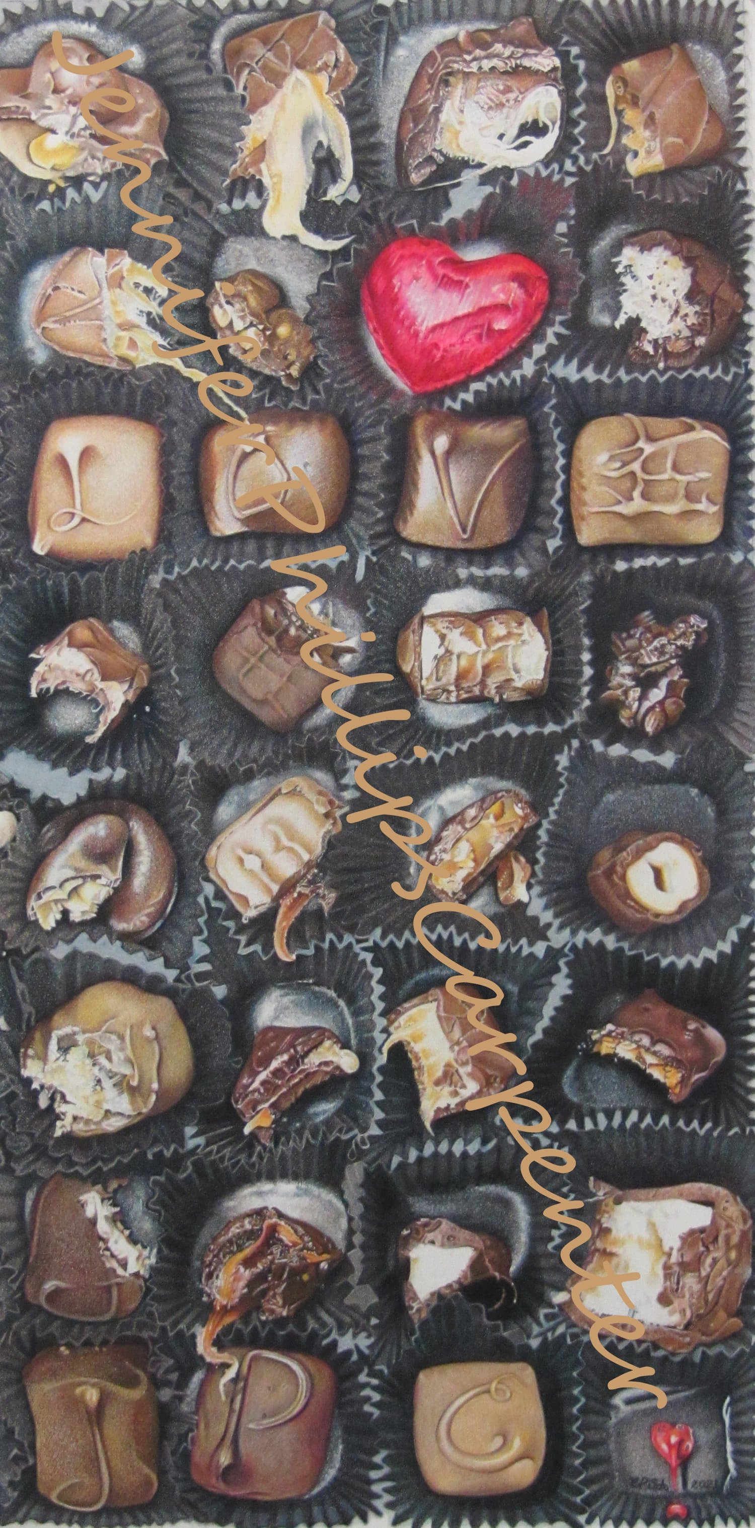 Have you ever wanted to do something completely unacceptable and get by with it? That's what this artist was feeling after a year in isolation, so what is sure to become a series of "Life After 50" imaginings was born. Jennifer states this is her all time favorite thus far in all of her nearly 4 decades of drawing with colored pencils. It's wild. It's whimsical. It's decadent. It's naughty. And it WAS delicious! This piece changed course every day! There was no preliminary sketch or anything! Just a grid that was 4 squares by 8 squares, 1 square per intended chocolate, to serve as a guideline where the chocolates and papers could spread and conform to neighboring goodness. The artist first rearranged the chocolates to her liking by color and pattern, then at the start of each work day, took a bite out of the chocolate of the day, positioned its newly revealed contents back in the box, "artistically", then photographed the single chocolate and how it related to its neighbors. How it would progress changed with each bite, each day! Patterns resembling letters inspired her unique signature, "JPC" for Jennifer Phillips Carpenter, the bitten "J" above her initials for "Jane", her late mother's name and her given middle name. The message: don't settle for less than you desire, "Seek and Ye Shall Find".