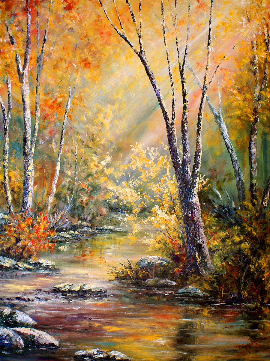 Fine Art High Quality Reproduction from an original oil painting that I've incorporated into an oak room divider in our home. This is an image painted from my imagination but I was really having fun with the water in the foreground. Water's challenge can be capturing the thing you see below the surface, the reflections and colors of the surrounding area and yet still get the shadows cast across and on the creek bottom.