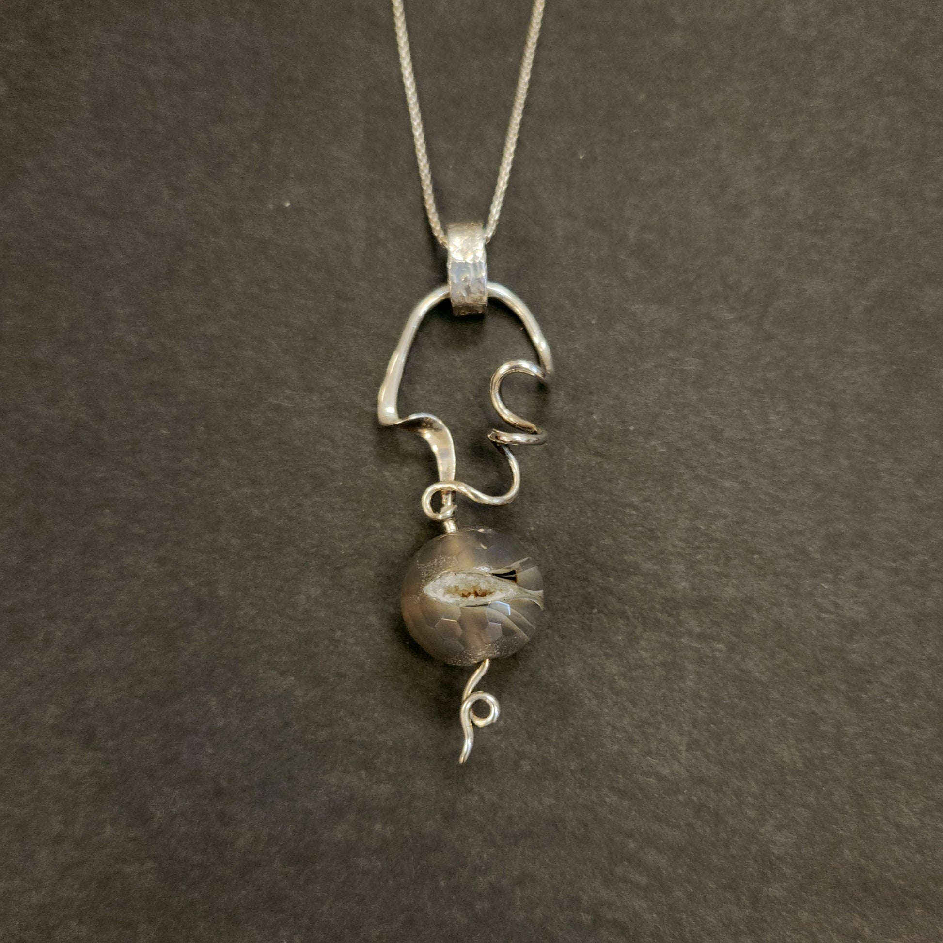 Sterling Silver pendant made by forging and fabricated the metal and it features a druzzy agate round faceted bead. On a sterling silver chain. The price of this item includes shipping and insurance.