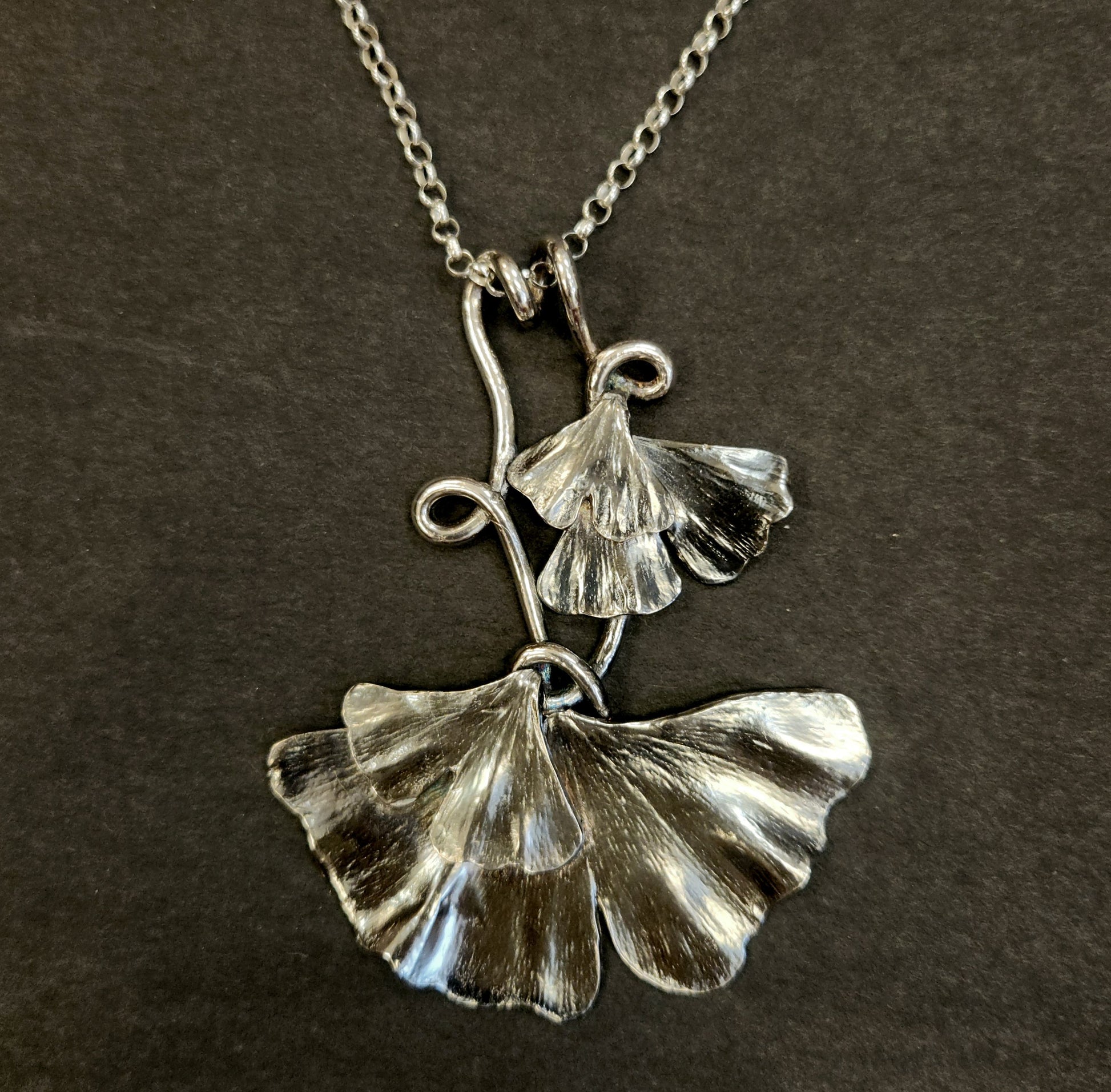Sterling Silver pendant featuring an array of Ginko leaves. These pieces are made using Sterling Precious Metal Clay and impressions of real leaves. Every piece is one of a kind and a strong reflection of the native plants along the Blue Ridge Mountains of VA. On a sterling silver 18-inch rolo chain. The price of this piece includes shipping and insurance.