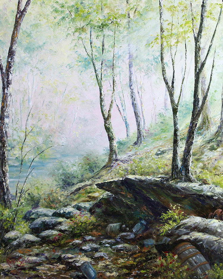 I like to tuck surprises into paintings to give an underlying meaning, even if jokingly tongue in cheek. This was painting for a themed show on recycling. The discarded moonshine still and all the paraphernalia became recycled homes to the neighborhood animals even as over time they rusted and sank into the ground.