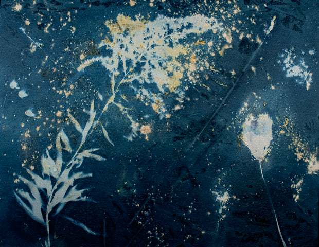 Wet cyanotype of various botanicals, "seasoned" with tumeric and wood ashes.