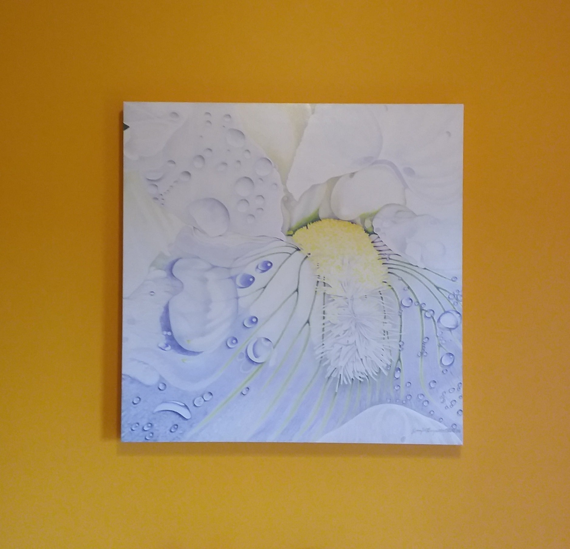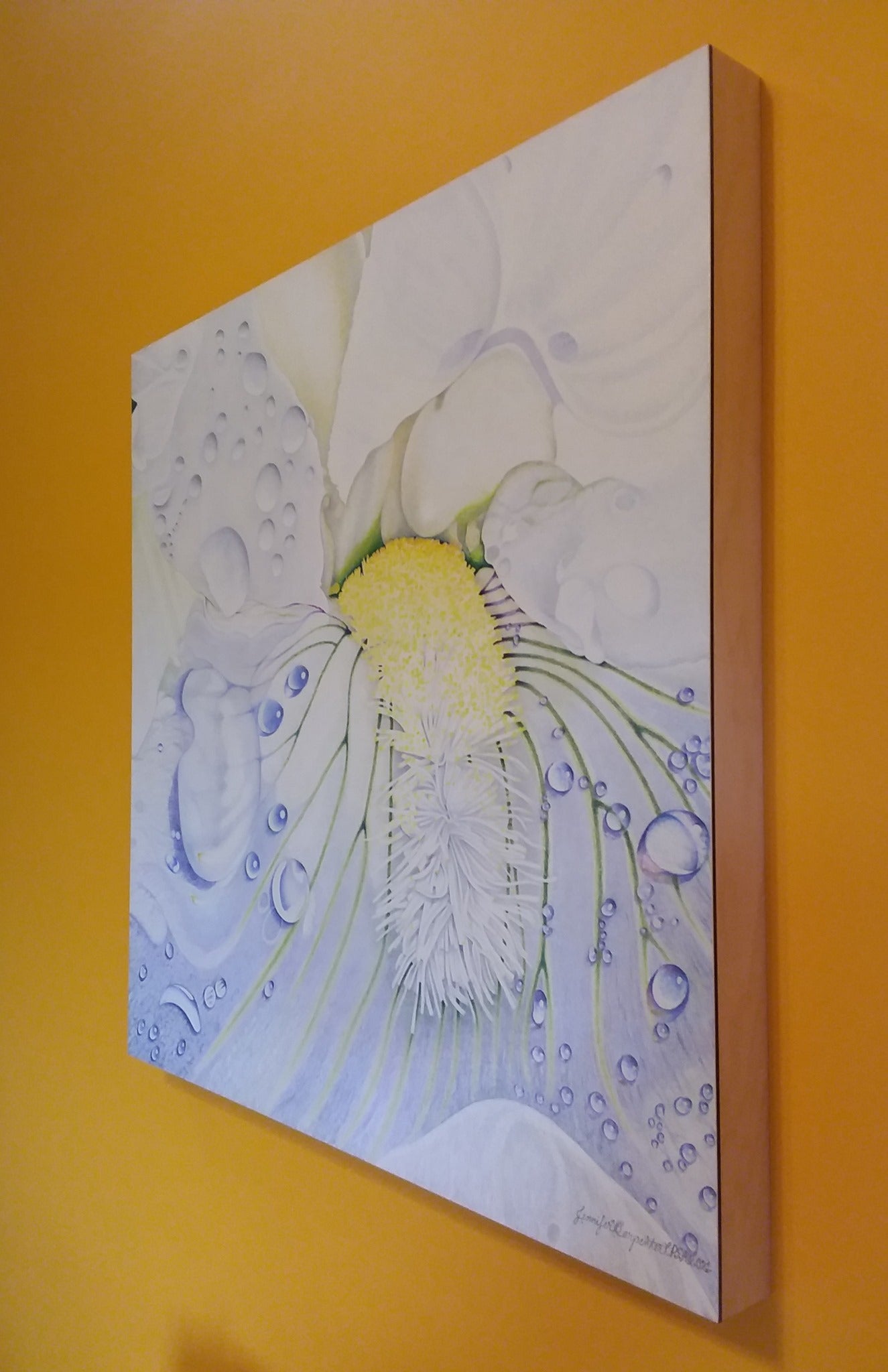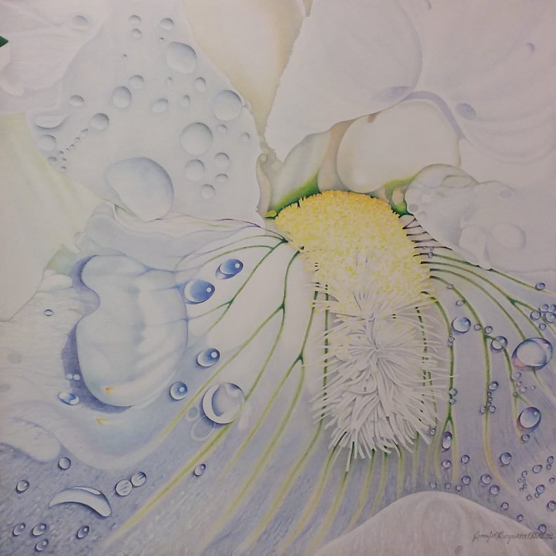 How many colors does it take to draw something white? It really depends on the time of day and, if outdoors, the weather! Irises have what this artist considers a welcoming fascination...an inner chamber of luxury and opulence. By the time you're close enough to observe, an intoxicating scent might envelope the viewer. For this piece the artist wished to convey the magic that unfolds with each bloom. The lines. The grace. The jewels left behind by a passing spring shower; here and now, to be gone shortly. The elegance and shimmer. Look closely. This girl (The Bearded Lady) is committed to her first competition, but will be available for purchase soon after her return!