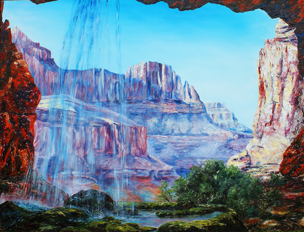 One very hot summer, we hiked the north trail into the Grand Canyon. Halfway down to the river is Cottonwood Campground. The temperature was over 110 in the shade when we had made it that far. We found upon exploring the area a little that Ribbon Falls was a short distance away. We spent the afternoon there where the falling water and the rock outcrop which gave great shade dropped the temperature at least 20 degrees. It felt heavenly. We could even walk behind the mound in a shallow cave where the falling water had deposited minerals over the years. This painting was done in my studio after returning home showing the view from behind the falls.