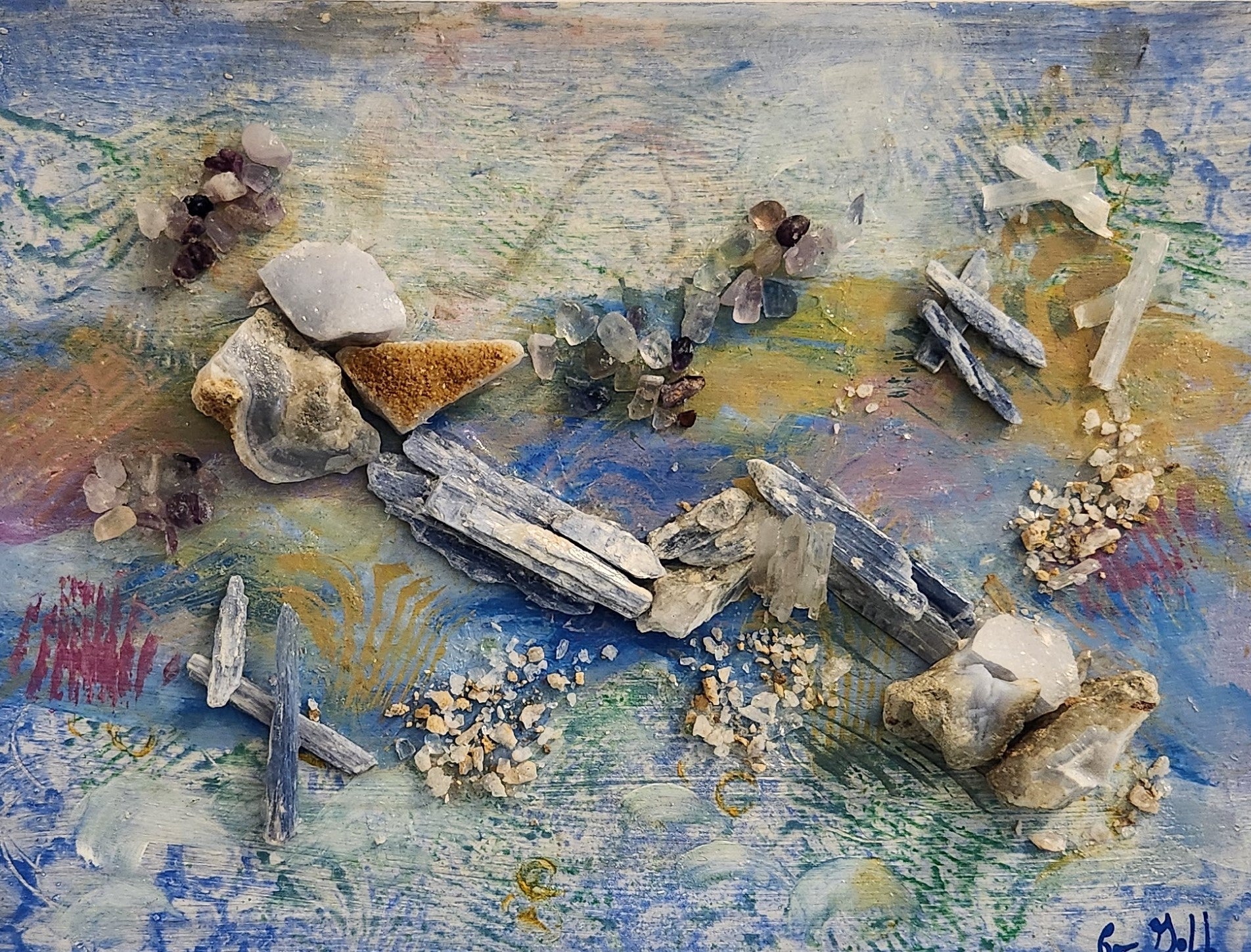 8x8 Acrylic on Wooden panel. Gemstones: Blue Lace Agate, Kyanite, Oco Geodes