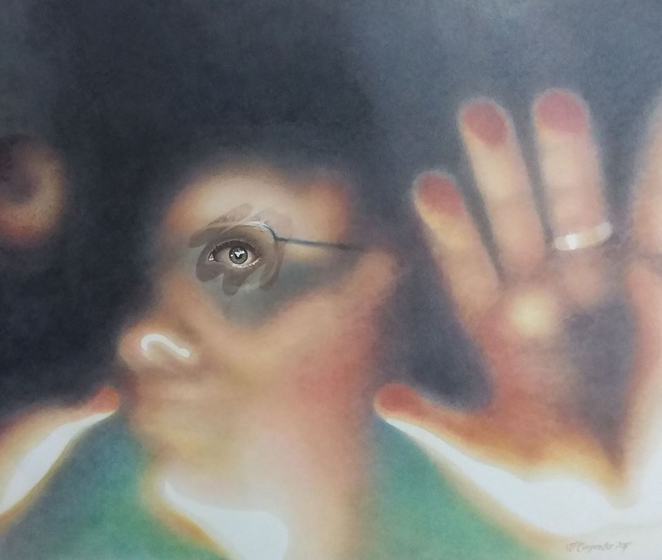 The artist's husband was her reluctant model. She says no one in her household is ever quite sure what her vision is when she asks for volunteers!